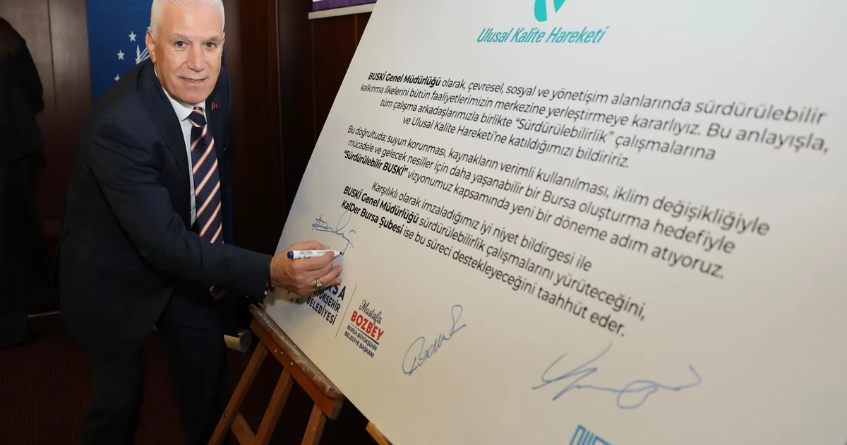 Büyükşehir Belediye Başkanı Mustafa Bozbey, BUSKİ Genel Müdürü Mehmet Ercihan Subaşıoğlu ve KalDer Bursa Şubesi Yönetim Kurulu Başkanı Serkan Ürkmez tarafından “Ulusal Kalite Hareketi İyi Niyet Bildirgesi” imzalandı.